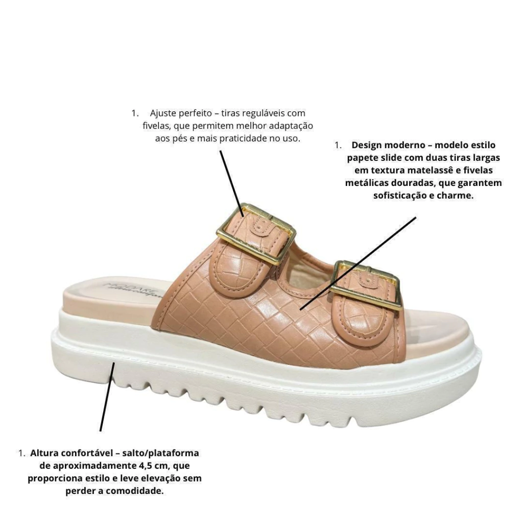 Sua plataforma de 4,5 cm garante leve elevação sem abrir mão do conforto. A palmilha anatômica com tecnologia Ultra Conforto proporciona maciez e absorção de impactos, ideal para uso diário. O solado emborrachado leve e antiderrapante oferece segurança e estabilidade em cada passo.